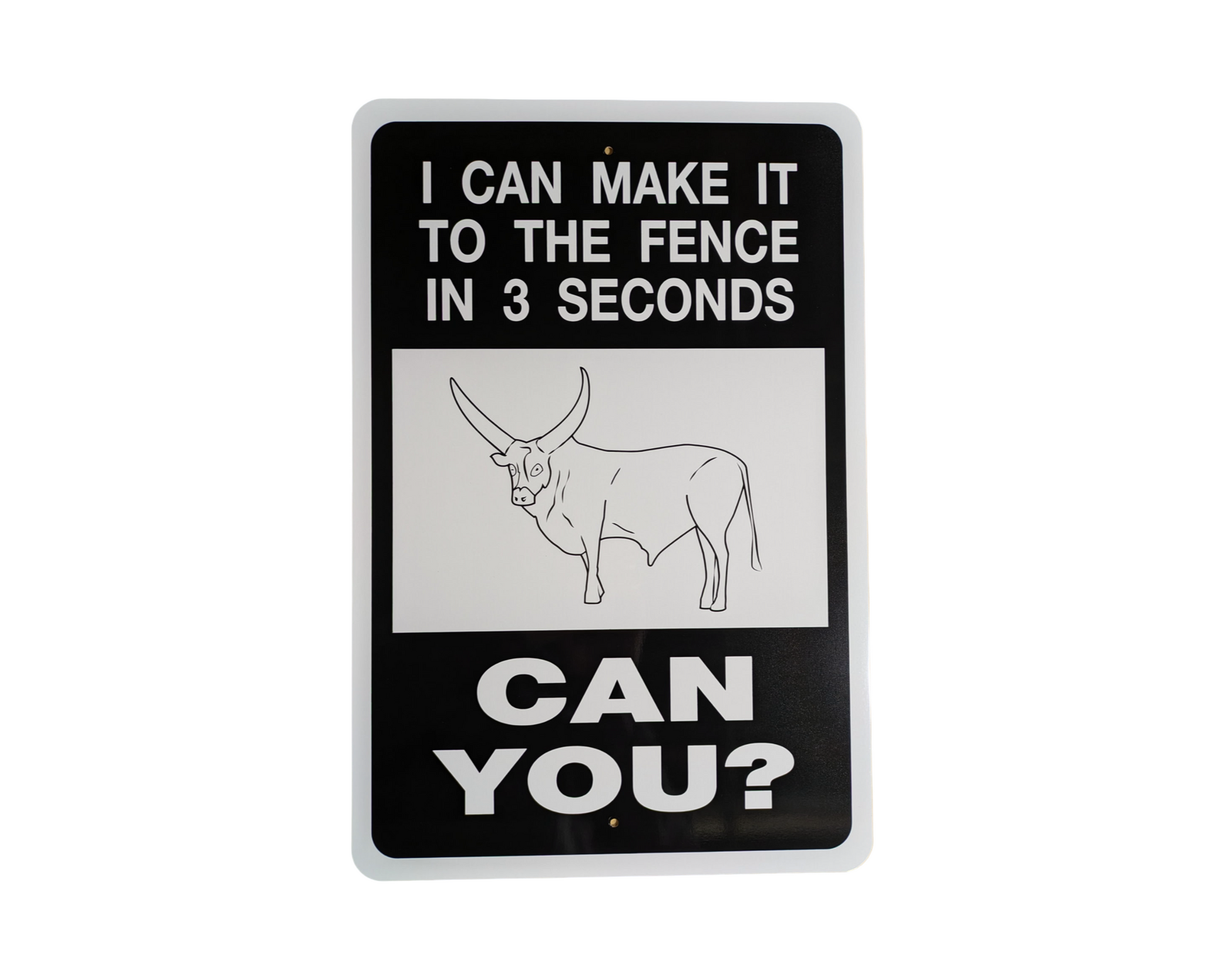 I Can Make It To The Fence In 3 Seconds Watusi Aluminum Sign aluminum sign. Available in 2 Signs. This durable sign can be used for both outdoor and indoor use.